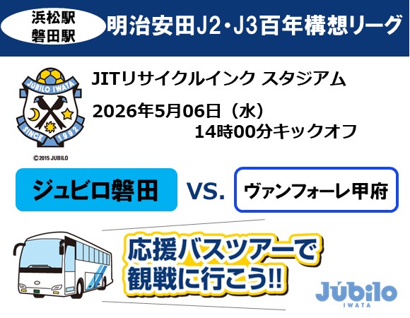 5/06(水) | 浜松駅(7:40)==磐田駅(8:30)==(途中休憩15分×1回)== JITリサイクルインク スタジアム(12:00~17:00) 【ジュビロ磐田 VS. ヴァンフォーレ甲府】 ≪キックオフ:14:00~≫ ※PK戦を想定した出発時間となります。 ==(途中休憩15分×1回)= 磐田駅(20:00) =浜松駅(20:50頃) ※試合終了後、30分後に出発を予定しております。 ※移動時間につきましては渋滞を考慮しておりますが、 交通状況により時間が変更となることもございます。 食事条件 朝:なし 昼:なし 夕:なし |