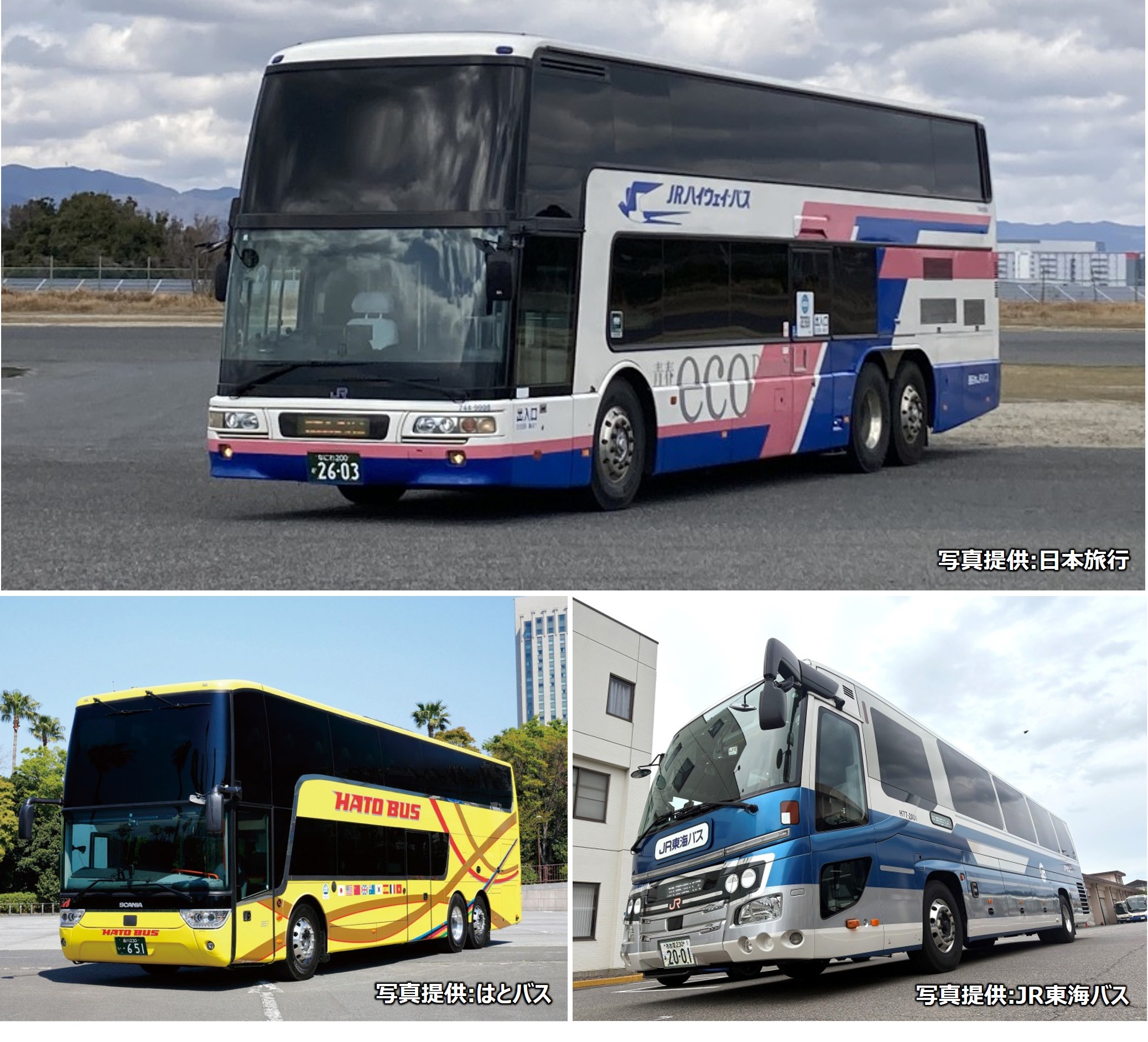 西日本JRバス「エアロキング」,JR東海バス「レトロバス(セレガ)」,はとバス「アストロメガ」が