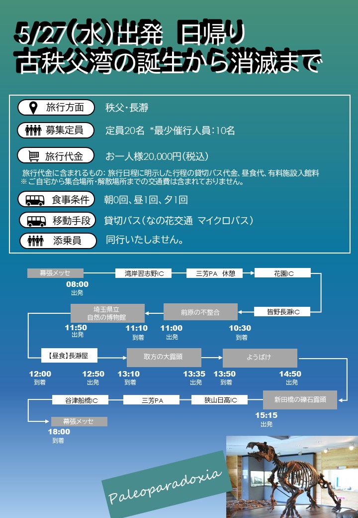 コース⑤5月27日(水)日帰り【古秩父湾の誕生から消滅まで】埼玉県の秩父地域は古くから研究が行われ、「日本地質学発祥の地」とも言われる様々な岩石や地層が観察できるエリアです。