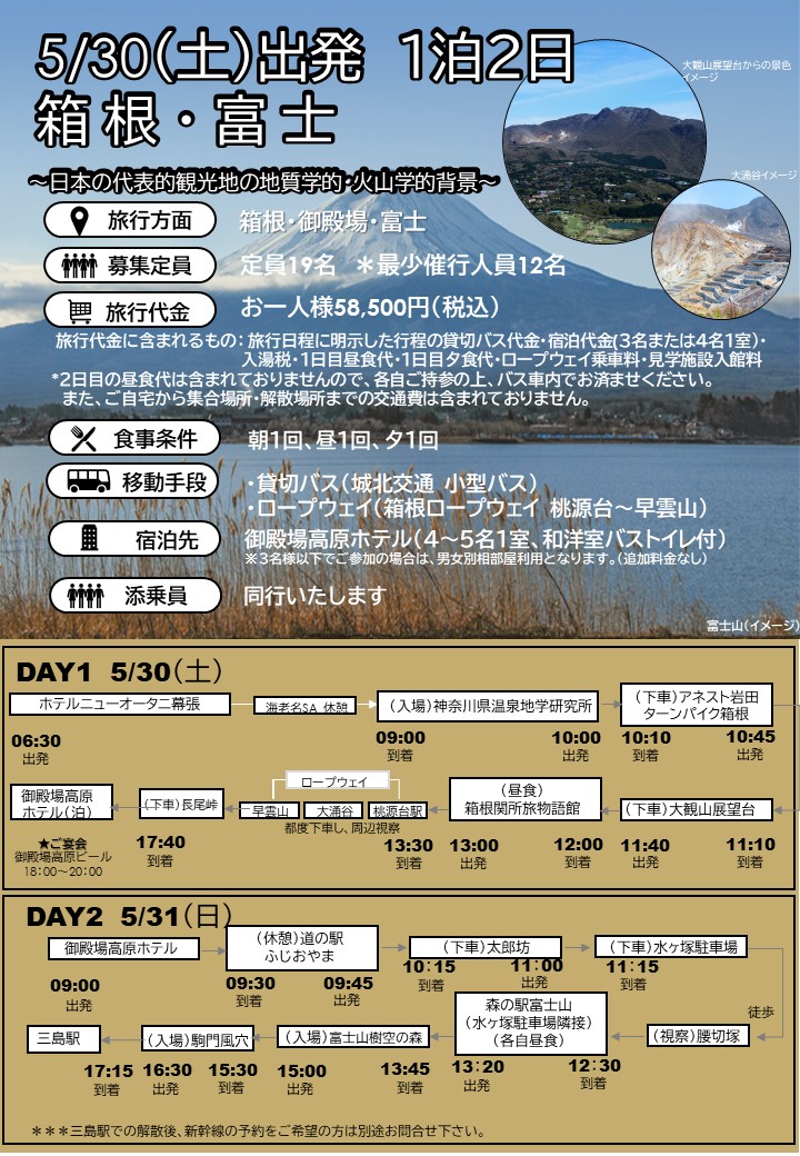 コース⑥5月30日(土)出発 1泊2日【箱根・富士~日本の代表的観光地の地質学的・火山学的背景~】日本を代表する温泉地・箱根と、日本の象徴である富士山麓を訪れます。