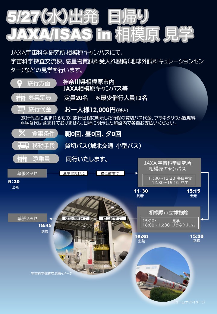 ・ツアー予約及びお支払い期限は5/12(火)です。【5/27(水)出発 JAXA宇宙科学研究所 見学ツアー】のみ、5/7(木)正午締切となります。