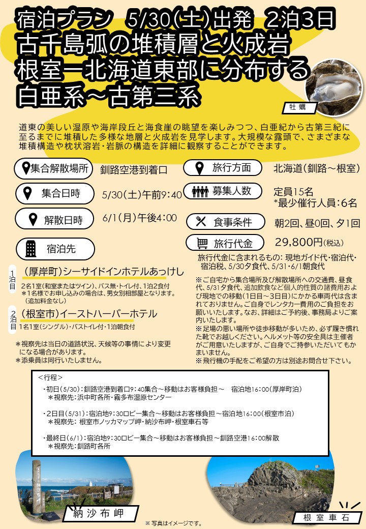 コース⑦宿泊プラン 5月30日(土)出発 2泊3日【古千島弧の堆積層と火成岩 根室ー北海道東部に分布する白亜系~古第三系】道東の美しい湿原や海岸段丘と海食崖の眺望を楽しみつつ、白亜紀から古第三紀に至るまでに堆積した多様な地層と火成岩が多くあります。