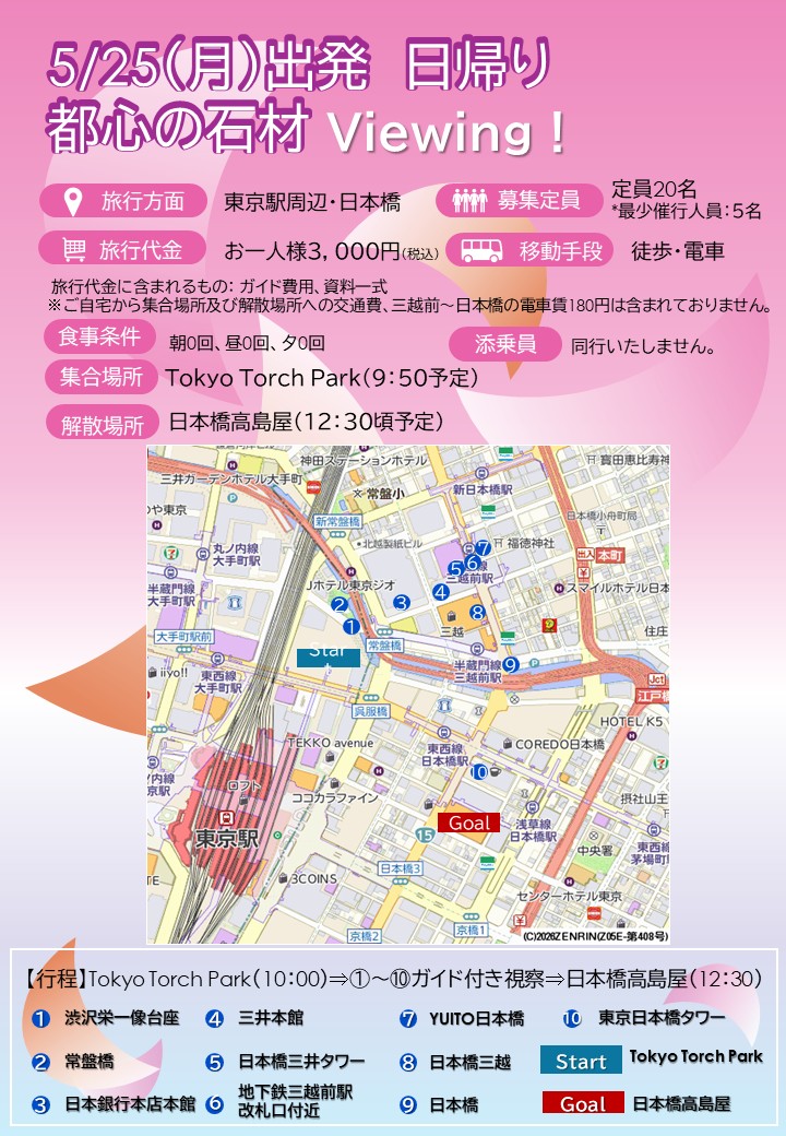 コース①5月25日(月)出発 日帰り【都心の石材 viewing!】都心の建築物には貴重で興味深い石材が多く使われています。このツアーでは日本橋周辺の歴史的建造物に使われている石材を見つつ、散策します。