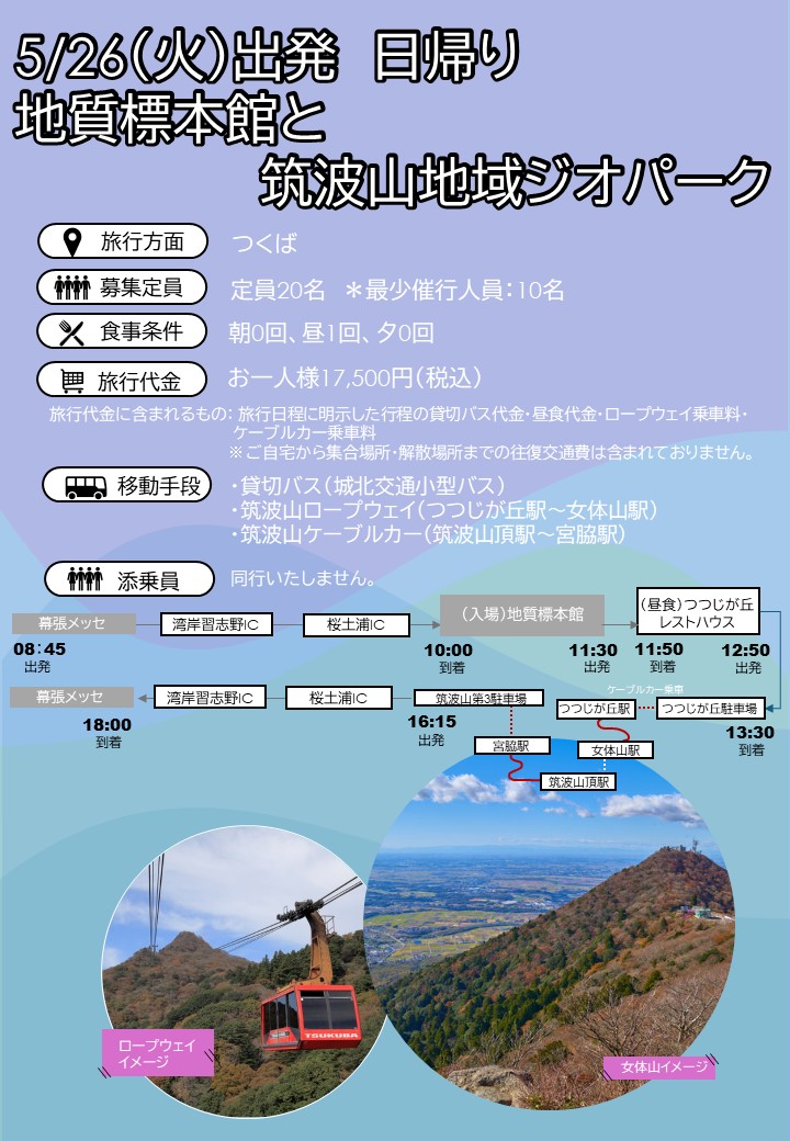 コース②5月26日(火)出発 日帰り【地質標本館と筑波山地域ジオパーク】産総研地質調査総合センターの展示普及施設である地質標本館と関東の秀峰・筑波山の地質を巡るツアーです。