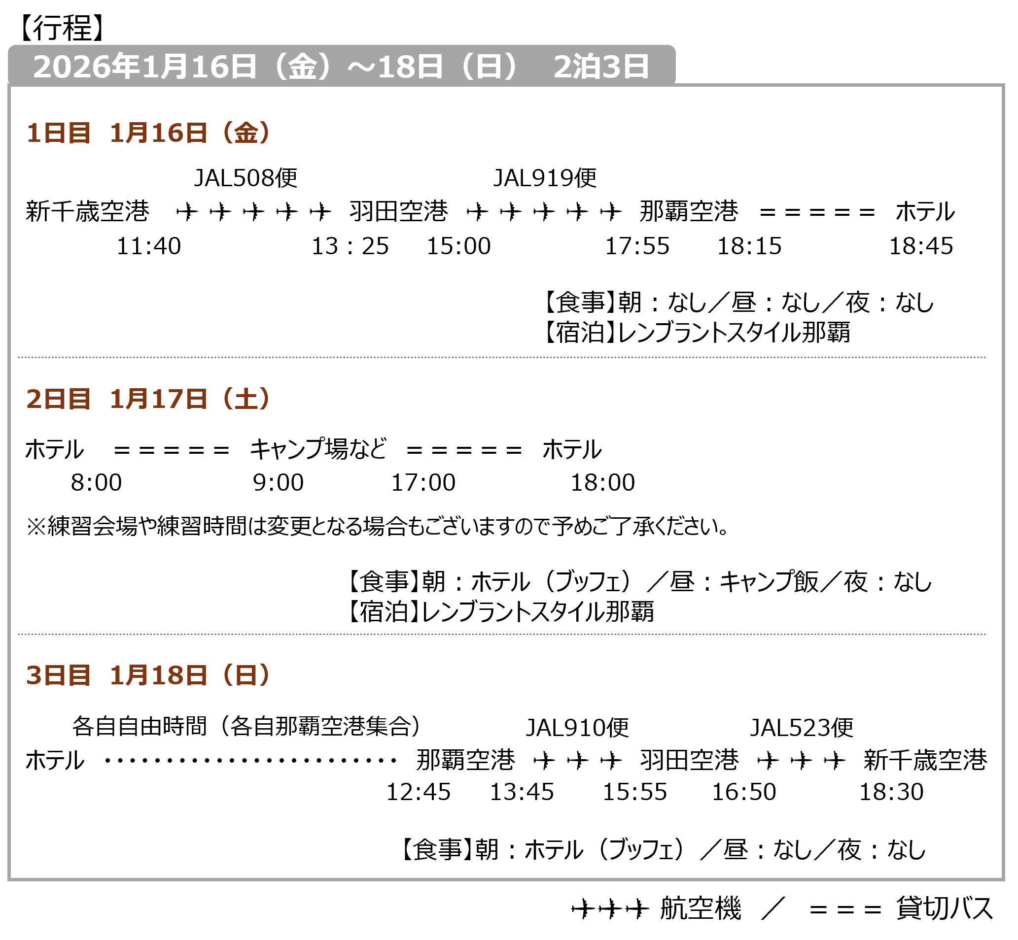また、復路の欠航・遅延により追加費用が発生する場合は保険において上限20,000円の補償がございますが、補償上限を超える実費については参加者の皆様にてご負担をいただくこととなります。