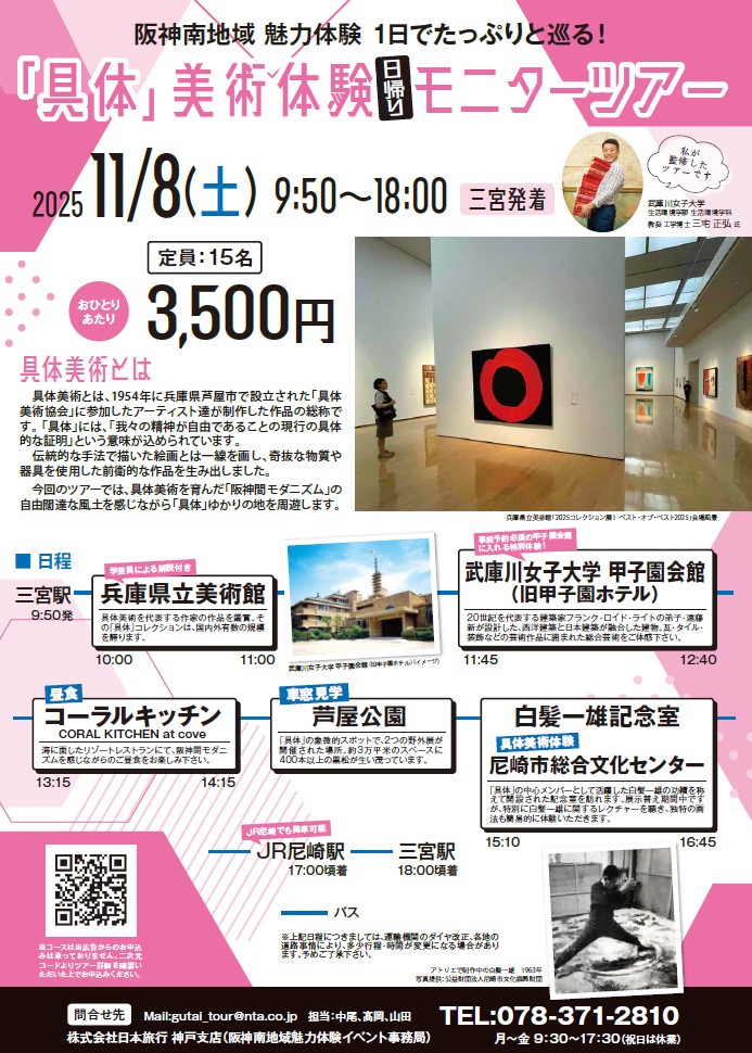 | 1 | 11月08日 (土) | ・09:35 JR三ノ宮駅前付近集合 ・09:50 出発 10:00~11:00 【兵庫県立美術館】 学芸員による解説付で具体美術を代表する作家の作品を鑑賞。 その「具体」コレクションは、国内外有数の規模を誇ります。 ・11:00~11:45 =バス移動= ・11:45~12:40 ・12:40~13:15 =バス移動=【甲子園会館】 20世紀を代表する建築家フランク・ロイド・ライトの弟子・遠藤新が設計した、西洋建築と日本建築が融合した建物。 瓦・タイル・装飾などの芸術作品に囲まれた総合芸術を ご体感下さい。 ・13:15~14:15 【コーラルキッチン】でイタリアン料理 海に面したリゾートレストランにて、阪神間モダニズムを感じながら ご昼食をお楽しみ下さい。 車窓見学 【芦屋公園】 「具体」の象徴的スポットで、2つの野外展が開催された場所。 約3万平米のスペースに400本以上の黒松が生い茂っています。 ・14:15~15:10 =バス移動= 15:10~16:45 【白髪一雄記念室・尼崎市総合文化センター】 「具体」の中心メンバーとして活躍した白髪一雄の、 功績を称えて開設された記念室を訪れます。 展示替え期間中ですが、特別に白髪一雄に関するレクチャーを聴き、 独特の画法も簡易体験いただきます。 ・=バス移動= ・17:00頃 JR尼崎駅付近 ・18:00頃 JR三ノ宮駅付近 解散 | 朝食 × 昼食 🍴 夕食 × |