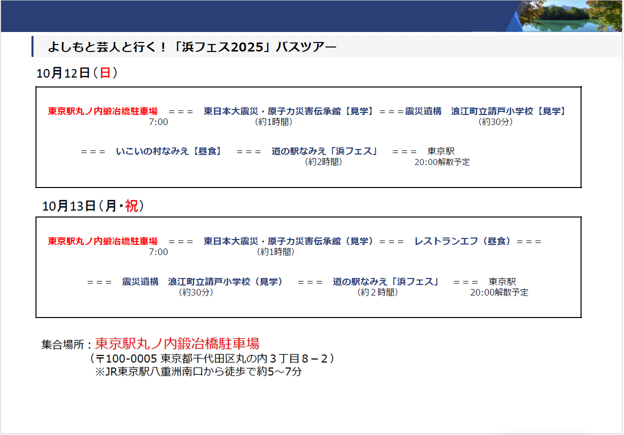 出発日:2025年10月12日(日) または 10月13日(月・祝) 日帰り ★ツアーガイド★ よしもと福島県住みます芸人