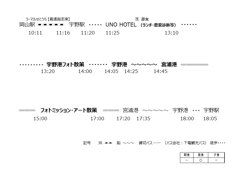 ※当日はJR宇野駅で解散となります。(JR岡山駅までのJR券と周辺スポットのご紹介を当日させていただきます)
