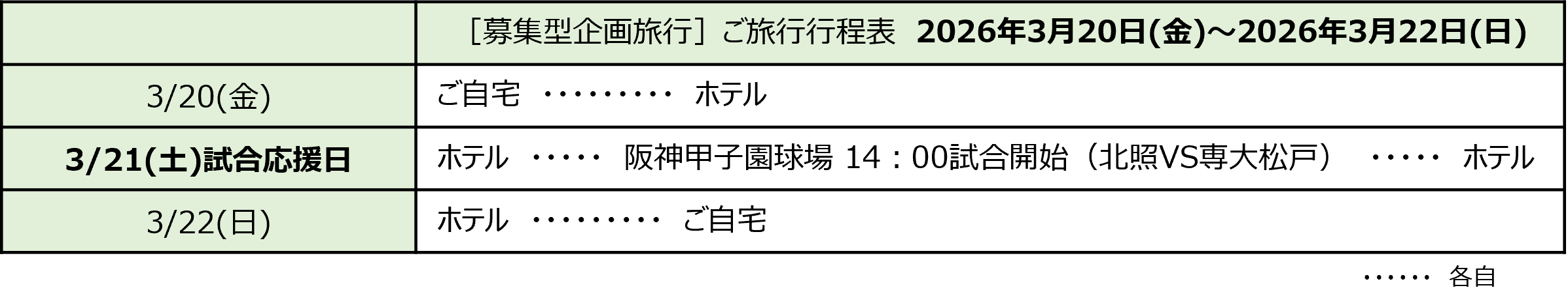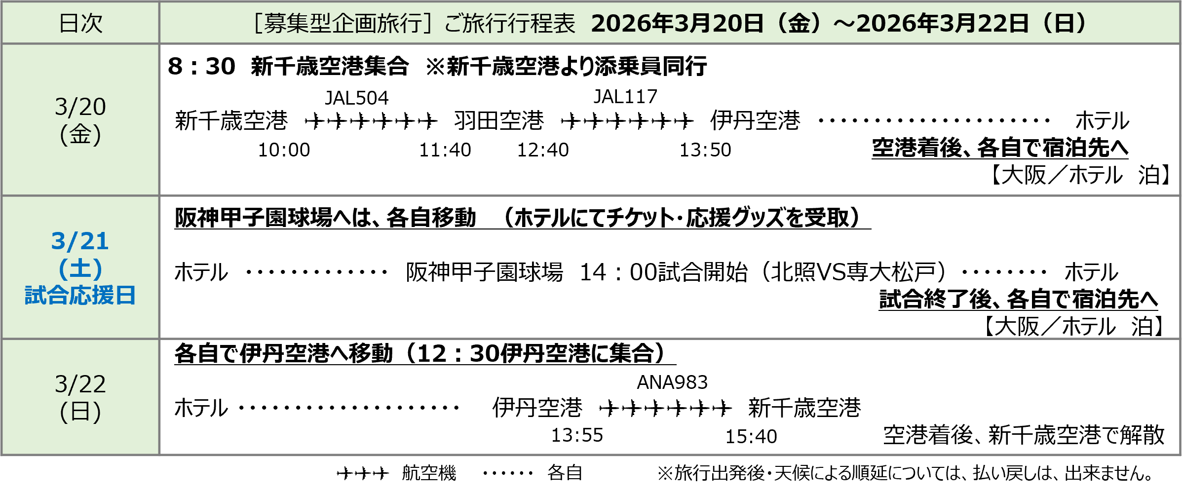 ご旅行日程表に明示した宿泊費、食事代(朝食2回)、アルプス席観戦チケットと応援グッズ