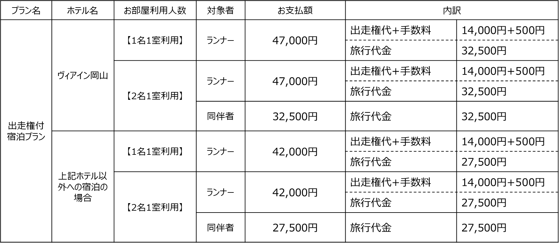 下記URLの「おかやまマラソン2026 出走権なし宿泊プラン」より別途お申込みください。出走権なし宿泊プランはこちらーーーーーーーーーーーーーーーーーーーーーーーーーーーーーーーーーーーーーーー■出走権付 宿泊プラン 予約締切・お支払締切予約締切日 :2026年6月1日(月)17:00まで