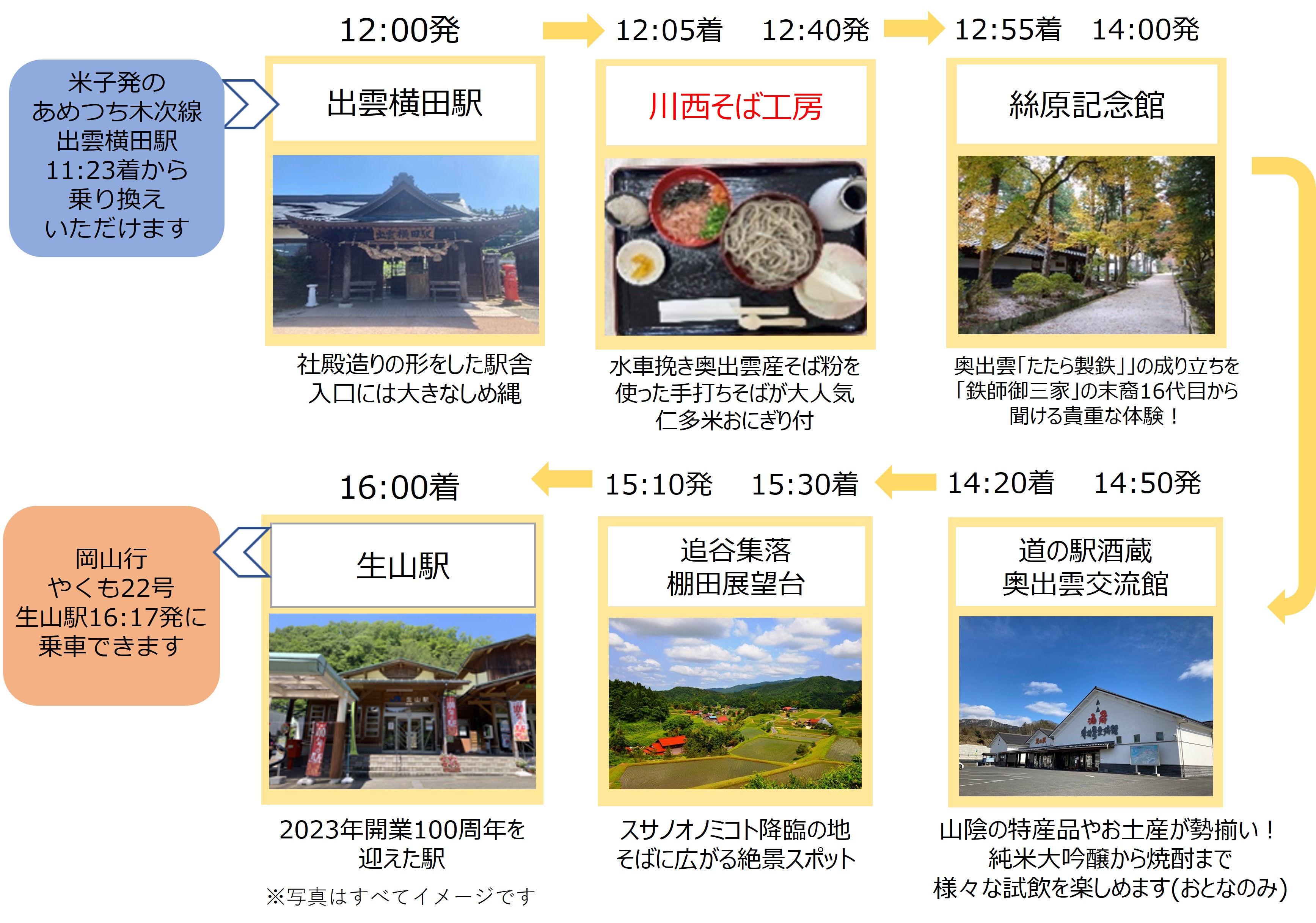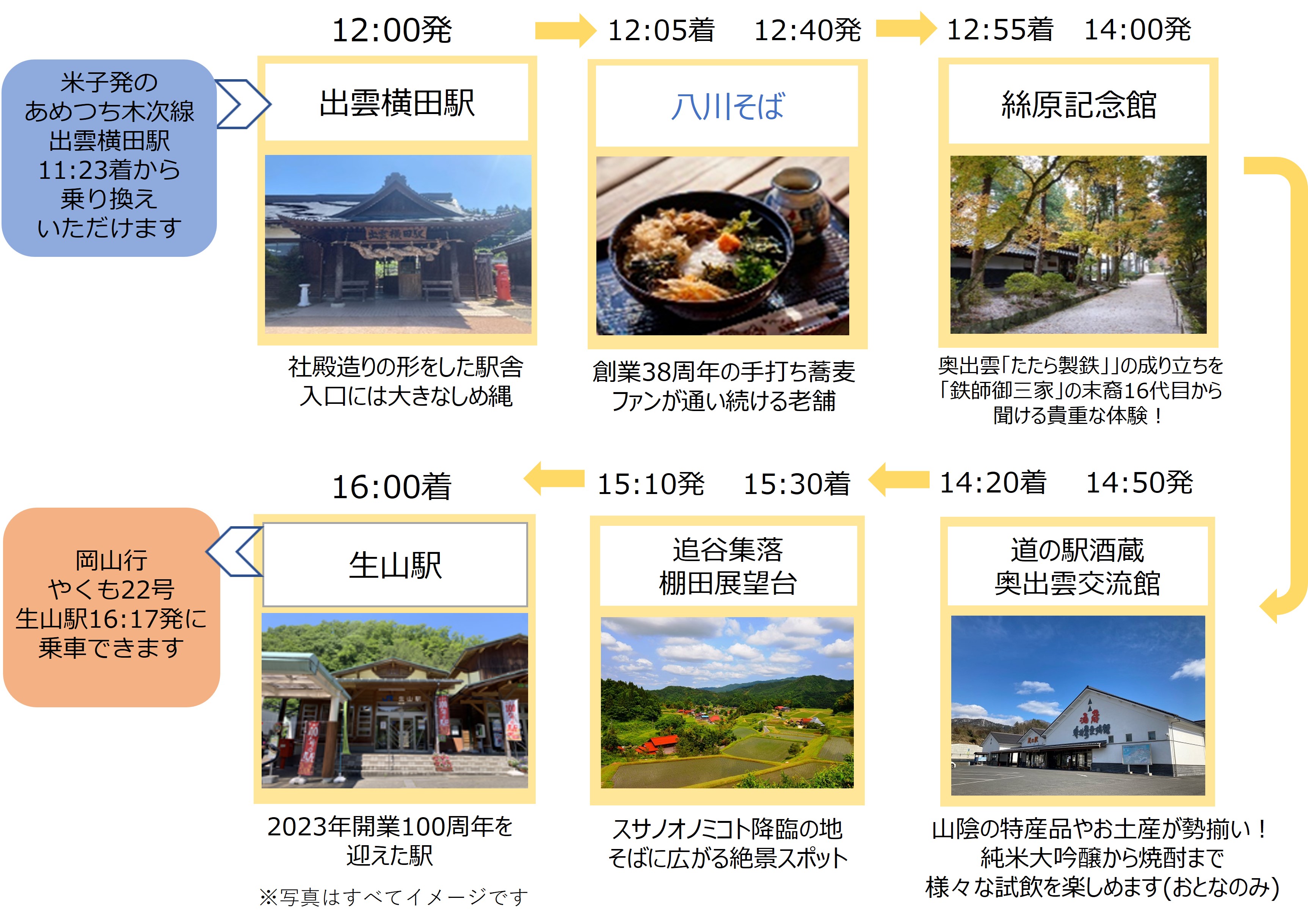 (2)下記コースにおいて、対象列車が運転休止または以下の遅れが発生した場合。①②出雲横田駅→生山駅(観光便)出雲横田駅12:00発→立ち寄りスポット→生山駅16:00着