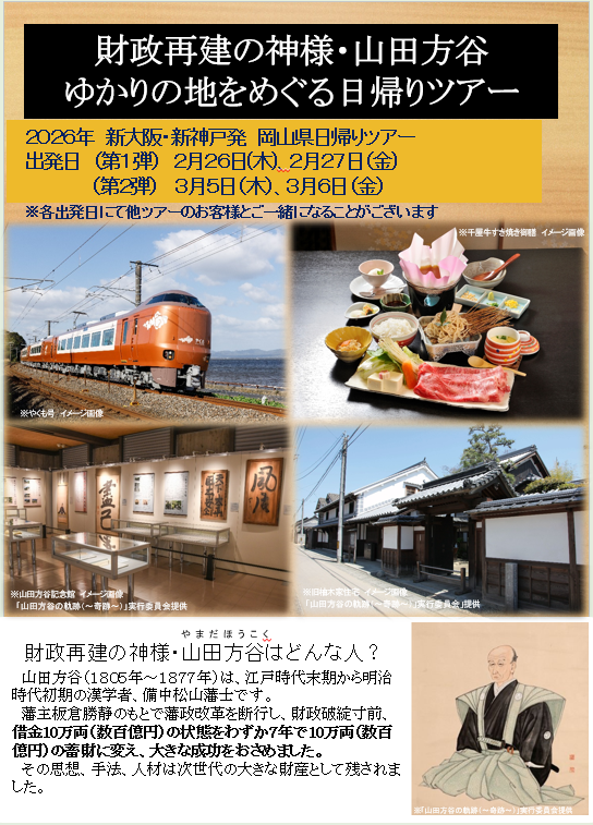 岡山県北部、西部へご案内します。山田方谷や関連人物のゆかりの地のほか、見どころ沢山です。
