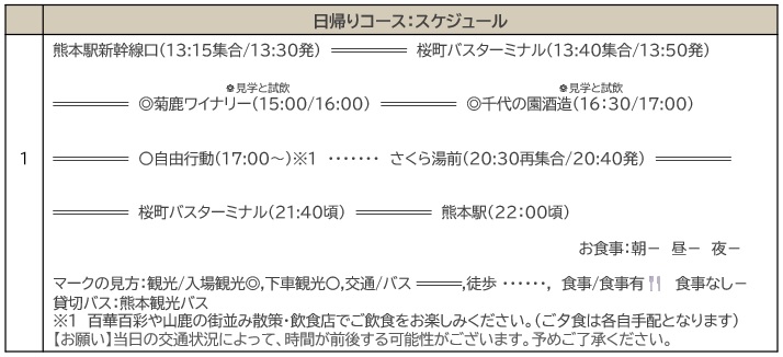 貸切バス代(熊本観光バス・中型バス)、菊鹿ワイナリー(テイスティング1杯付)、キラリブルワリービール1本、添乗員経費、乗務員経費、国内旅行傷害保険料(引受会社:損害保険ジャパン株式会社、補償期間:集合地から解散地まで、保険種別:国内旅行傷害保険、保険金額:死亡・後遺障害190万円/入院保険金日額2,100円/手術保険金 入院保険金日額の10倍(入院中の手術)または5倍(入院中以外の手術)/通院保険金日額1,300円/賠償責任(自己負担額なし)200万円))