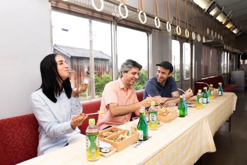 体験は12時15分、桑名駅構内の養老鉄道改札口前でガイドと合流することから始まります。特別に手配された「酒枡列車」のプライベート車両では、思い出に残るランチ列車を地元醸造の日本酒2本と枡のプレゼントとともにお楽しみいただけます。